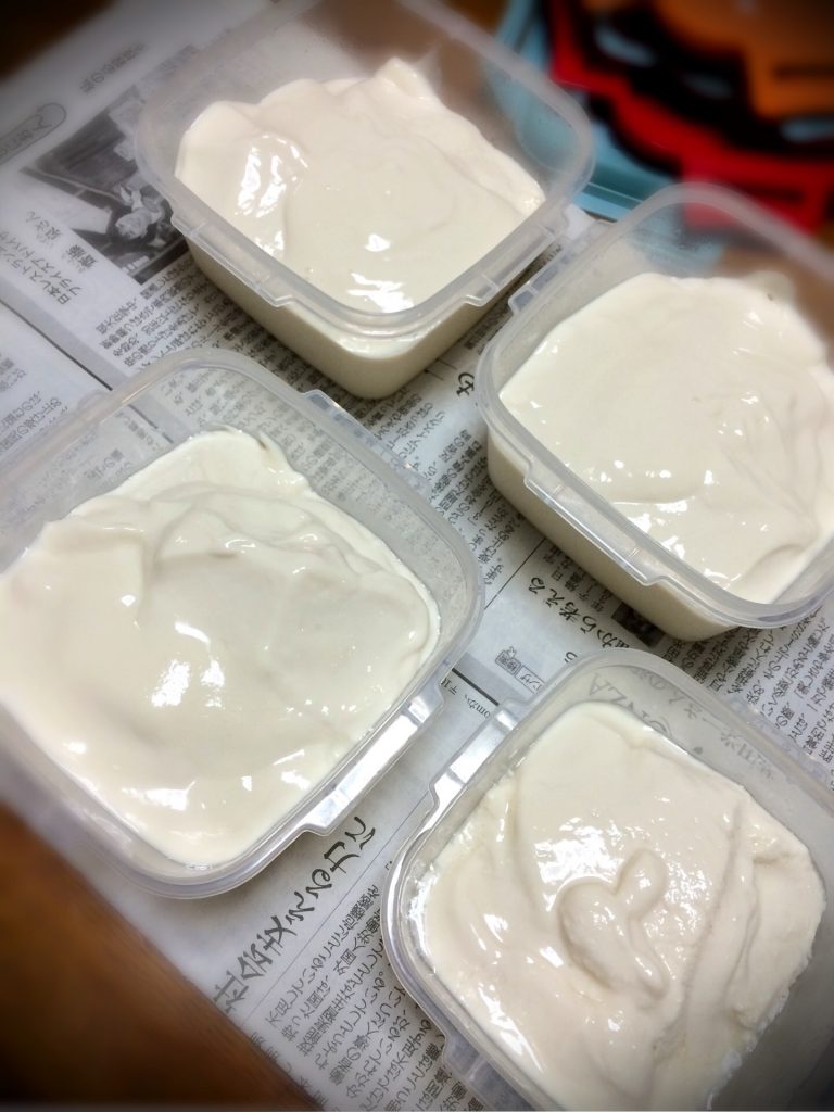 若干温度があるので、そのまま冷蔵庫に入れるのは、冷蔵庫の中の物考えるとちょっと抵抗あるのですが、ヨーグルト的には、室温で冷ますとかすると、出来上がりの状態が安定しないです。