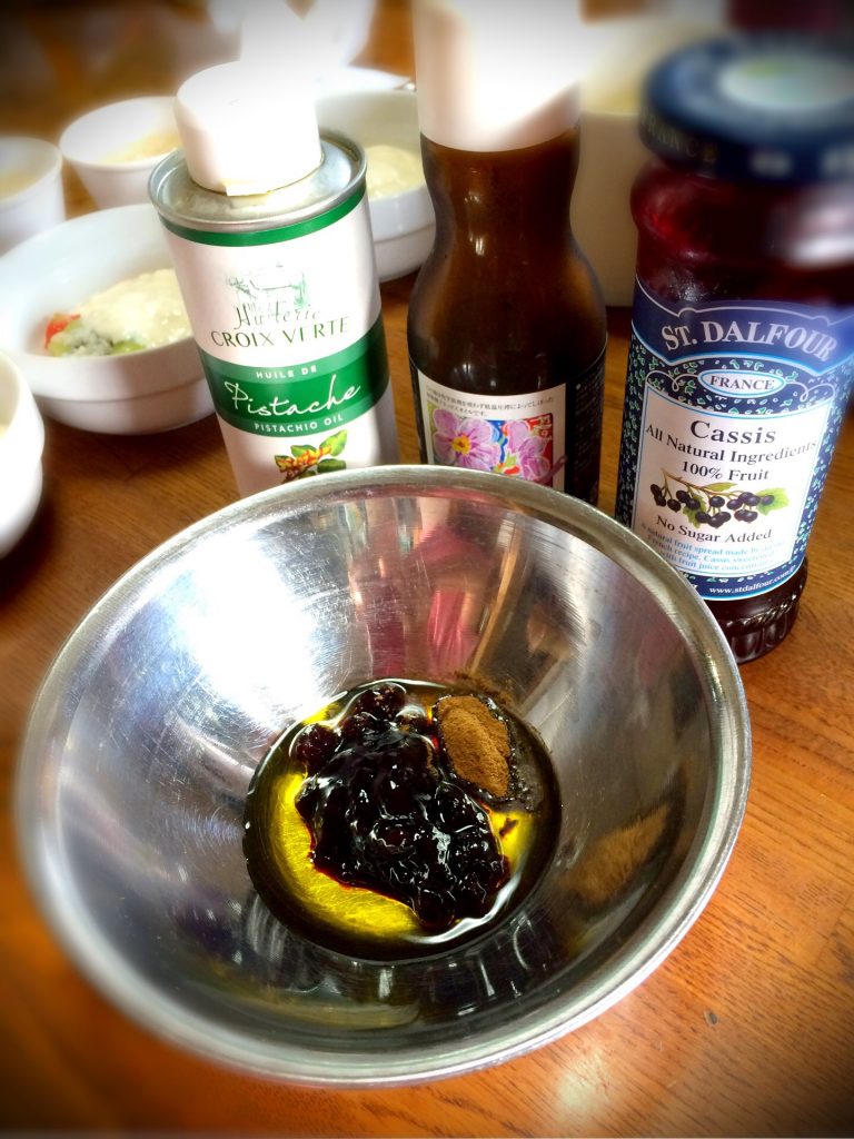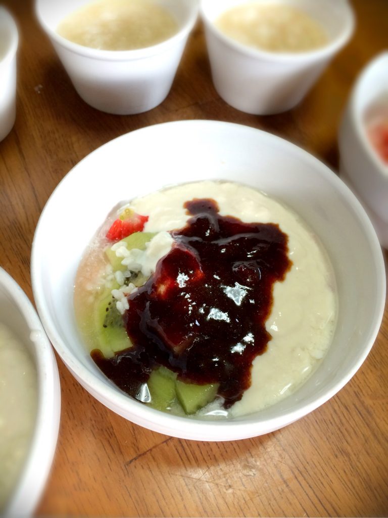 ダイスカットした果物に、甘酒を加え、そこに豆乳ヨーグルト、そしてカシスジャムをベースにしたソースを掛けて、毎朝おいし〜く頂いておりまする〜〜