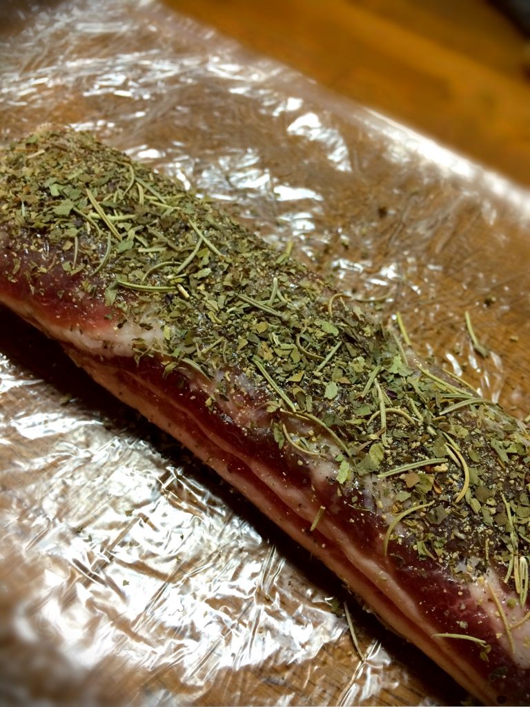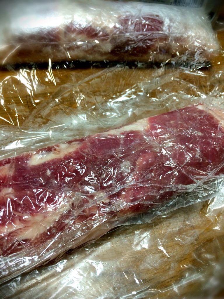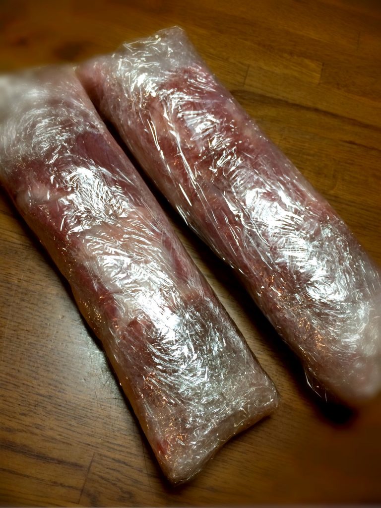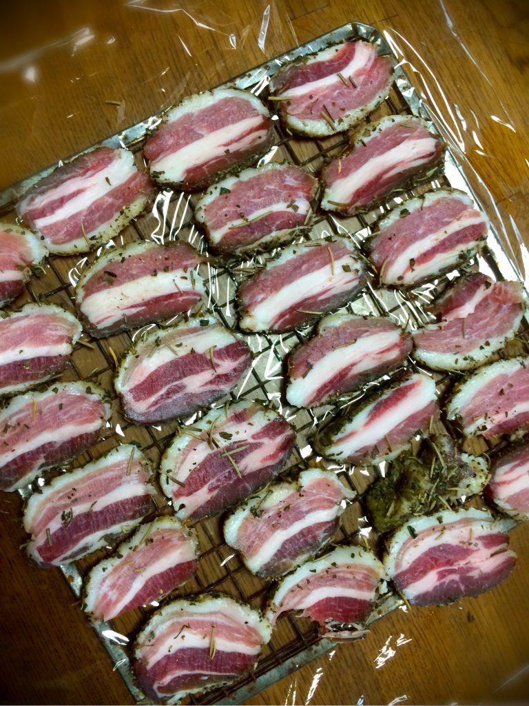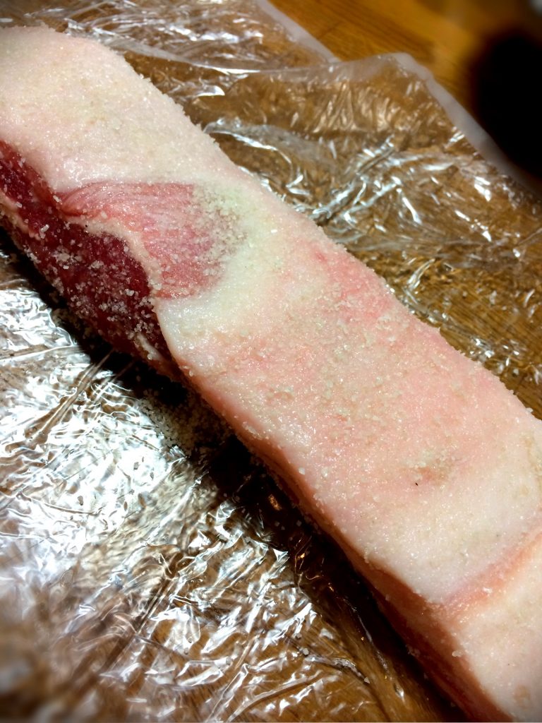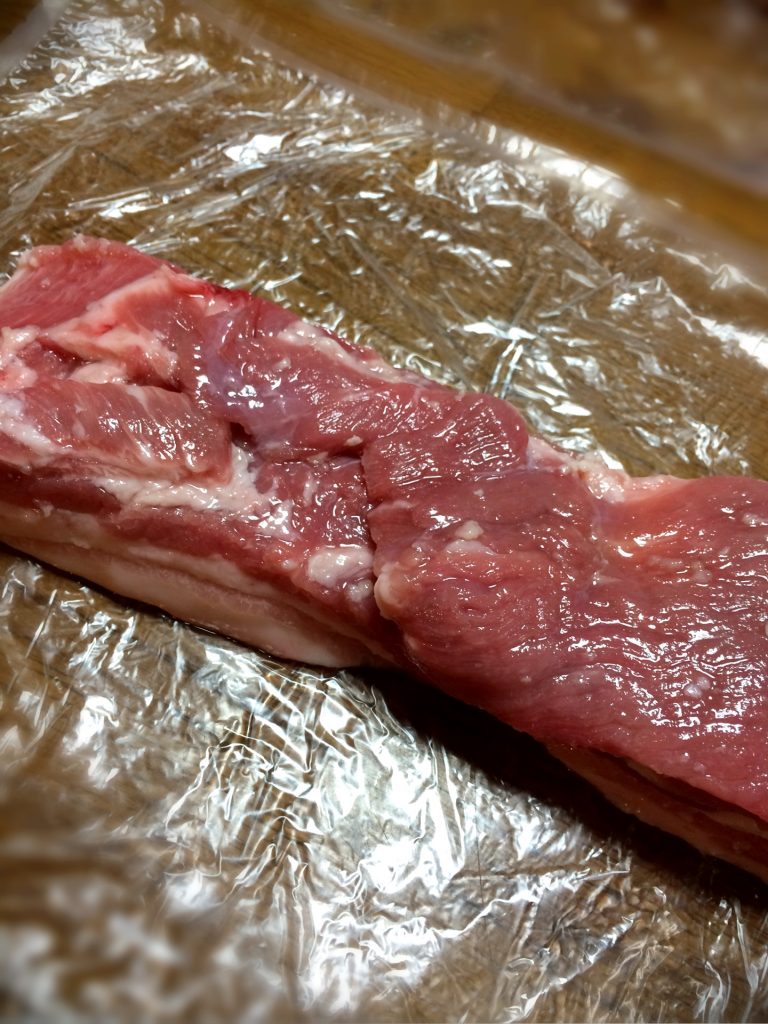 生ベーコン、パンチェッタの冷蔵庫を使った作り方でございます。
