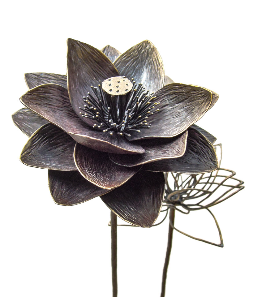 蓮の花が高く茎を伸ばし大きく咲いている姿を鉄で表現したアート作品です。