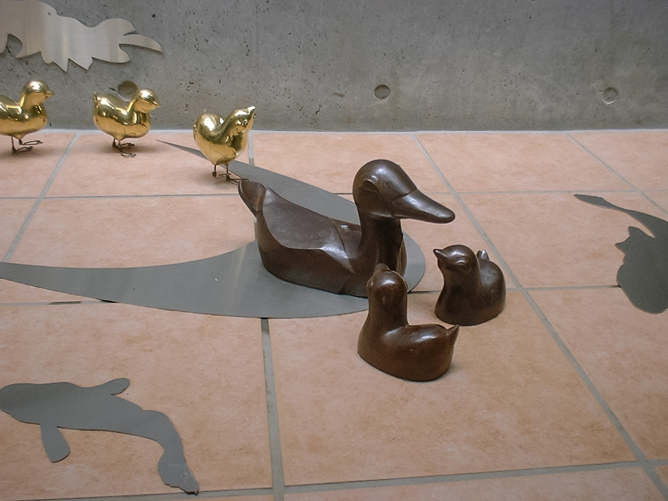 大きく下に垂れ下がっているステンレスの枝葉のそばで 水面に見立てた床の上をカルガモの親子のオブジェ(ブロンズ)がすべっていきます。